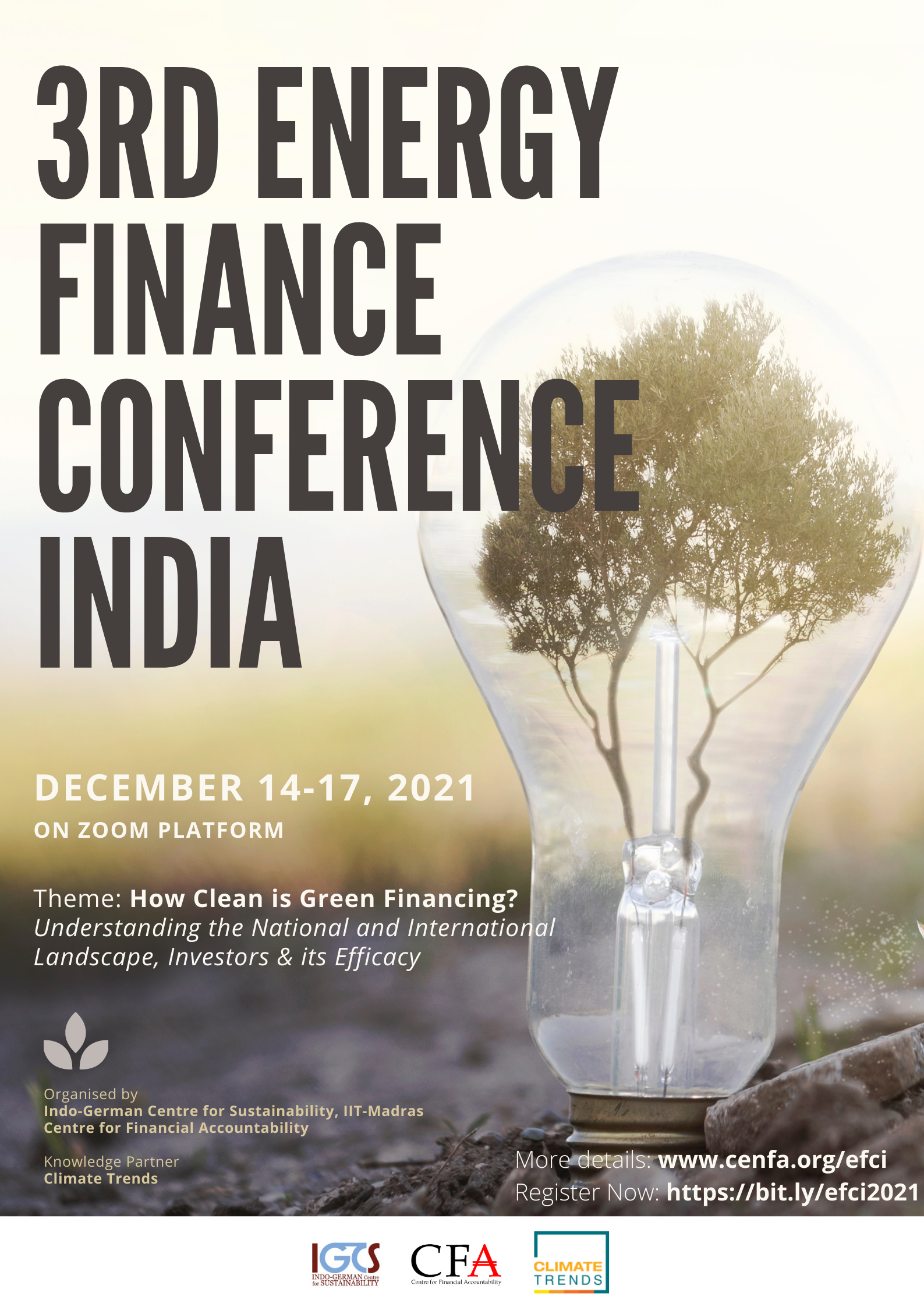 Joe Athialy Created an Event 4 years ago 3rd Energy Finance Conference India 14 DEC 2021 - 17 DEC 2021 Online Register Centre for Financial Accountability Indo German Centre for Sustainability - IIT Madras Climate Trends 3rd Energy Finance Conference India Theme: How Clean is Green Financing? Understanding the National and International Landscape, Investors & its Efficacy Date: December 14-17, 2021 On Zoom Platform Please see the Concept Note & Program Schedule Registration open now Share Share on Facebook Share on Twitter LinkedIn Add this Repost 0 likes 0 comments