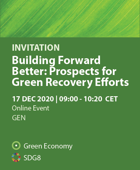 Clara Axblad Created an Event 5 years ago Building Forward Better: Prospects for Green Recovery Efforts 17 DEC 2020 Register Partnership for Action on Green Economy(PAGE) Geneva Environment Network As attention turns to managing the economic fallout from COVID-19 and the roots of this pandemic to avoid future crises, national and global recovery plans will be instrumental for the future of our planet, especially in support to the green deal strategies announced by various Member States. The recovery will bring diverse opportunities to accelerate the transition to a greener and more sustainable future. The European Green Deal, presented in December 2019 to achieve climate neutrality by 2050, is at the core of the European Union recovery plan from the COVID-19 pandemic. Korea took the COVID-19 crisis as an opportunity to invest in green and digital technology with its Green New Deal launched as part of the Korea New Deal in April 2020. The Partnership for Action on Green Economy (PAGE) is an important tool in assisting its partners as they navigate the recovery, promoting inclusive green economy plans that will create jobs and prosperity for all while reducing pressures on the planet. This event is convened by PAGE under the framework of the Geneva Environment Network. Speakers: Steven STONE, Head, Resources and Markets Branch, UNEP Victor VAN VUUREN, Director, Enterprises Department, ILO Asad NAQVI, Head, PAGE Secretariat H.E. Amb. Hyoeun Jenny KIM, Deputy Director-General, Global Green Growth Institute Thibaut PORTEVIN, Policy Ocer, Green Economy, Directorate-General for International Cooperation and Development (DG DEVCO), European Commission Sonia PEÑA-MORENO, Coordinator, Global Biodiversity Policy and Governance, IUCN Angus MACKAY, Head, Division for the Planet, UNITAR Tags green recovery green stimulus inclusive green economy Share Share on Facebook Share on Twitter LinkedIn Add this Repost 1 like 0 comments