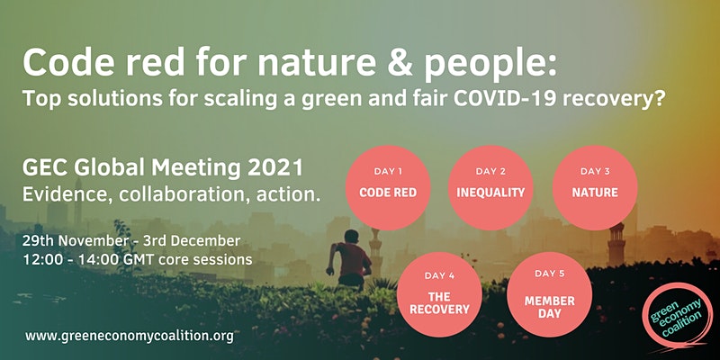 Gayeon Shin Created an Event 4 years ago GEC Global Meeting 2021 29 NOV 2021 - 3 DEC 2021 Register Green Economy Coalition On 29 November-3 December 2021, the Green Economy Coalition is hosting the virtual GEC Global Meeting 2021, a global gathering connecting networks worldwide on a mission to accelerate the transition to green and fair economies. The programme will assess the status of the global recovery agenda, share evidence of what is working in different locations, and decide on shared interventions to scale green and fair recovery. Offering a unique opportunity to fast-track economic policy, the meeting will also hold side sessions and other events by members and partners suited to different themes and time zones. The event will also work to draft a "Green COVID Recovery Declaration", calling on governments to take immediate action in the build-up to Stockholm+50 in 2022. There will be five different themed days with events focused on the green economy transition: Day 1: Code Red for Nature & People Day 2: Inequality Day Day 3: Nature Day Day 4: Media Debate-The Recovery On Trial Day 5: Coalition Day Share Share on Facebook Share on Twitter LinkedIn Add this Repost 0 likes 0 comments