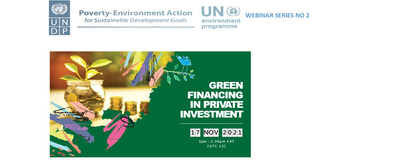 Cherryl ANDRE DE LA PORTE Created an Event 4 years ago Green Financing in Private Investments 17 NOV 2021 Register Poverty-Environment Action UNEP-UNDP Green Finance is broader than Climate Finance in that it also addresses other environmental objectives such as natural resource conservation, biodiversity conservation, and pollution prevention and control. The concept of private green finance refers to actions undertaken by governments and private entities that mobilizes and aligns private financing for economic activities that are supportive of environment improvement, climate change mitigation and more efficient resource utilization. These economic activities include the financing, operation and risk management for activities in areas such as environmental protection, energy savings, clean energy, green transportation, green buildings as well as environment-oriented financial products or services, such as loans, credit cards, insurances or bonds. To promote private green finance in the Poverty Environment Action for SDGs (PEA) programming, in the UN system and among development partners, PEA is pleased to be organizing a webinar on green private finance and available PEA, UNDP and UNEP tools. Time: 11:00am-12:30pm CET / 1:00-2:30 pm EAT (UTC+3) Tags green finance Share Share on Facebook Share on Twitter LinkedIn Add this Repost 2 likes 0 comments