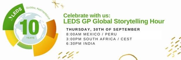 Felipe Gomez Created an Event 4 years ago LEDS GP 10 year Anniversary: Storytelling Hour 30 SEP 2021 Register LEDS Global Partnership Join us for the LEDS GP anniversary storytelling hour! The LEDS Global Partnership is turning 10 years old and we would like to celebrate with you! It won’t be a webinar like any other, it will be a celebration: Join us on the 30th of September to hear stories from your fellow LEDS GP members, take a moment to reflect on the past ten years, and get inspired for this upcoming, decisive decade of climate action! Five members of the LEDS Global Partnership from all around the world will share their personal stories with us and take us on a journey into the LEDS Global Partnership. We are looking forward to seeing you at the event and saying: Thank you for being a part of our network! How can you join? Option one To sign up, please just create a blocker of one hour in your calendar for the 30th of September – adapting the time to your own time zone. The celebration will take place at: 8:00 am Mexico, Colombia, and Peru 9:00 am Washington D.C. 3:00 pm South Africa and Germany 6:30 pm India 7:00 pm Bhutan And include the following invitation link in your calendar blocker, which you can just click on at the day of the event: Join from your computer or the mobile App Click here to join the meeting Option two Send us an informal email to the Global Secretariat Team (secretariat@ledsgp.org) and we will share the MS Teams invitation directly with you. We are looking forward to celebrating with you! Tags 10YearAnniversary LEDSGP LEDS Global Partnership Celebration StoryTellingHour Share Share on Facebook Share on Twitter LinkedIn Add this Repost 3 likes 0 comments