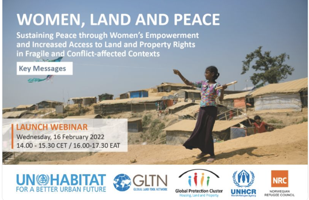 Clara Mottura Created an Event 3 years ago Women, Land and Peace: Sustaining Peace through Women’s Empowerment and Increased Access to Land and Property Rights in Fragile and Conflict-affected Contexts 16 FEB 2022 Register United Nations Human Settlements Programme(UN-Habitat) Global Land Tool Network The UN Refugee Agency On 16 February 2022, UN-Habitat, the Global Land Tool Network, and the Housing, Land and Property Area of Responsibility of the Global Protection Cluster, in collaboration with UNHCR and NRC, will host an online event to launch the “Key Messages on Women, Land and Peace. Sustaining Peace through Women’s Empowerment and Increased Access to Land and Property Rights in Fragile and Conflict-affected Contexts”. The role of women is pivotal to the prevention and resolution of conflicts, peacebuilding and peacekeeping. This role is often undetected and is consistently underreported. To adequately play their role as agents of peace, women need to feel secure in their communities and be empowered to participate meaningfully in decision making and planning. Housing, land and property rights are an essential enabler of both. The Key Messages, developed from operational experience, provide a quick reference on how to empower women and protect their housing, land and property rights in fragile and crisis affected contexts, and why this is an essential element to sustain peace and stability. During the webinar, colleagues from UN-Habitat, NRC and UNHCR will present the content of the Key Messages and some examples of their field implementation showcasing: How to increase the recognition and protection of women’s housing, land and property rights in fragile and conflict-affected contexts How to empower and increase women’s participation in processes related to land management and housing, land and property rights Women’s housing land and property rights for conflict prevention and recovery: the humanitarian-development-peace nexus The event will allow time for questions and discussion. The webinar will be held in English, with simultaneous translation in English, Arabic and French. Time: 14 - 15,30 CET Tags gender land rights Share Share on Facebook Share on Twitter LinkedIn Add this Repost 1 like 0 comments